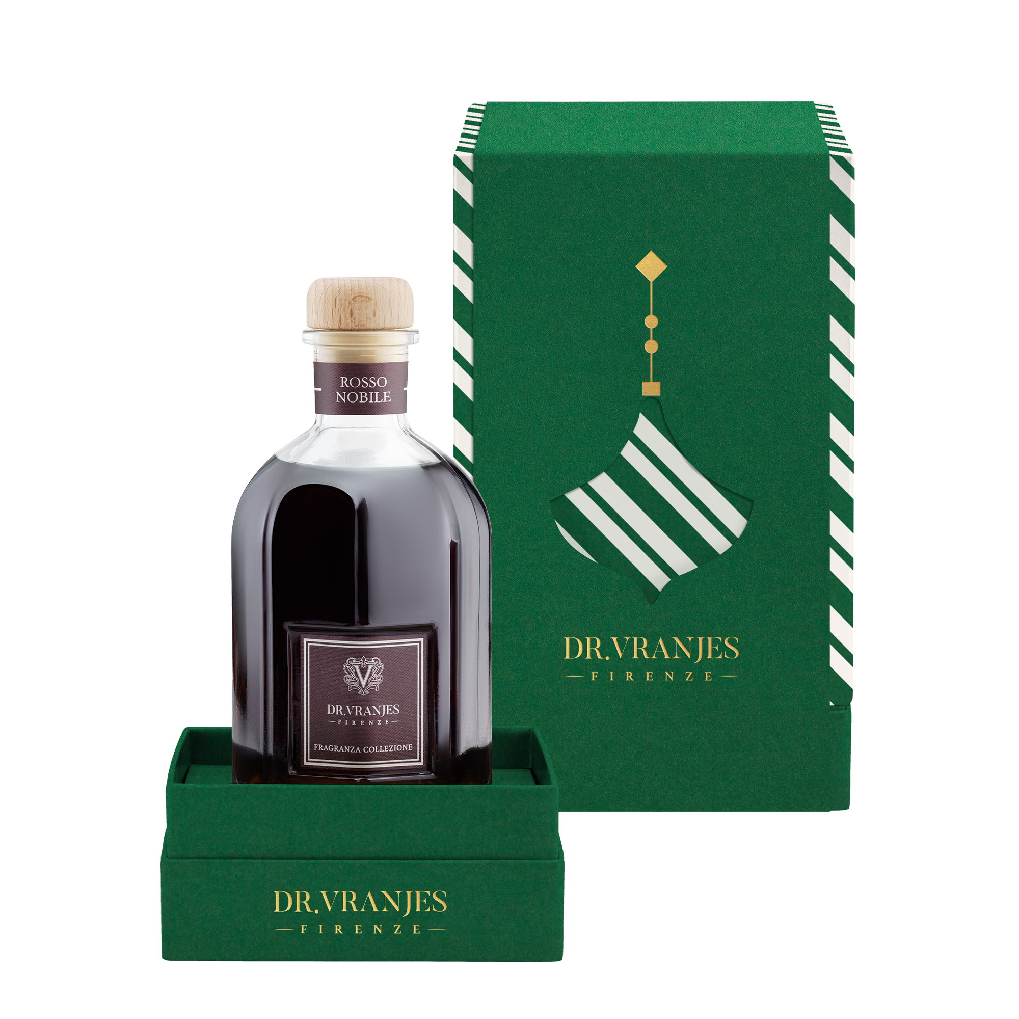 Диффузор объёмом 250 мл представлен в праздничной подарочной упаковке с фигурным «окошком»-елочной игрушкой, через которое видно стильный полосатый дизайн флакона. Набор доступен в двух ароматах: Albero di Natale — «Рождественская ель», созданный специально для новогоднего сезона, и Rosso Nobile — культовый букет, вдохновлённый глубоким, насыщенным ароматом бордоского вина. Такая подарочная коробка станет ярким акцентом декора и придаст особую атмосферу любым зимним праздникам.