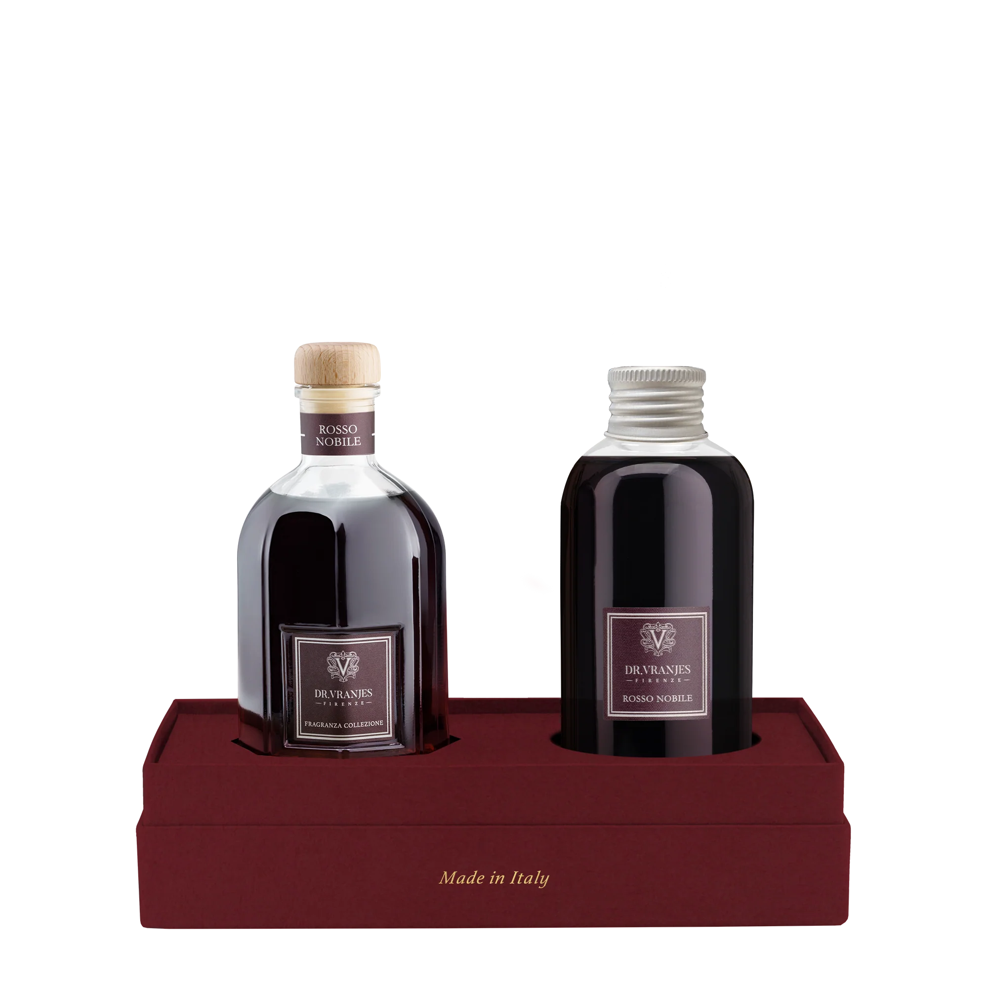 Подарочный набор от Dr. Vranjes Firenze Rosso Nobile 100 мл и наполнитель 150 мл — идеальный дуэт для ценителей изысканных интерьерных ароматов. В набор входит стильный диффузор с ароматом для дома объёмом 100 мл с палочками и сменный наполнитель 150 мл, что позволяет наслаждаться любимым запахом значительно дольше.